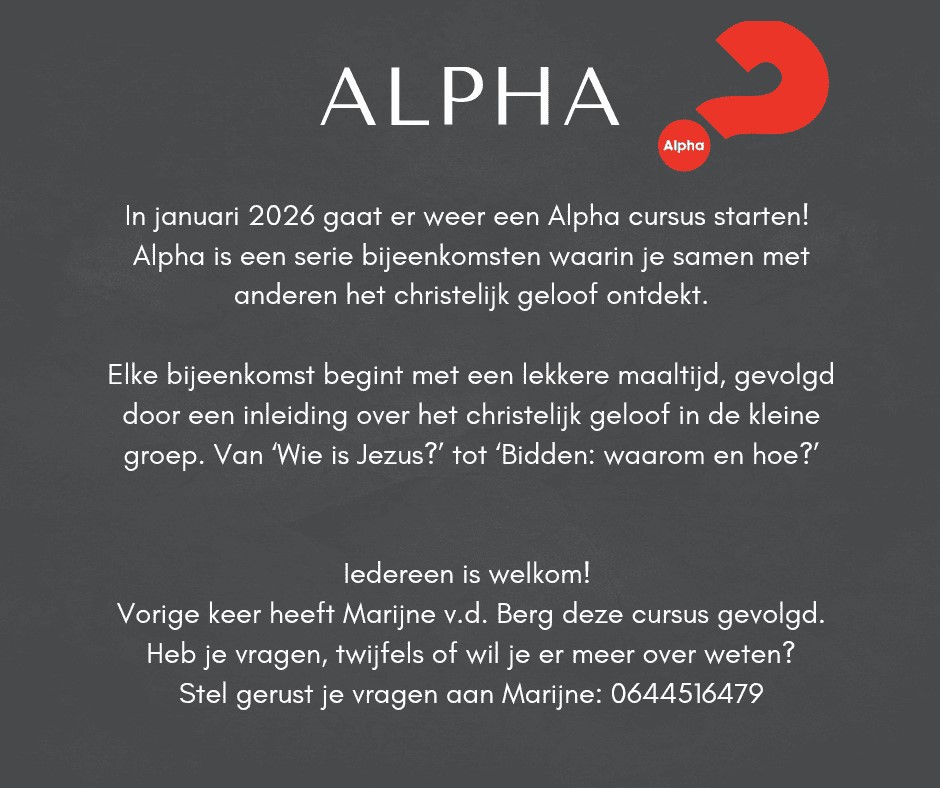 Vanaf 8 januari 2026 start er weer een nieuwe Alphacursus voor Goudriaan, Ottoland en daarbuiten! De Alphacursus is een mooie manier om je geloof te herontdekken en te verdiepen. We beginnen iedere avond met een maaltijd, gevolgd door een inleiding over een thema van het christelijk geloof. In kleine groepjes is er daarna voldoende ruimte om je eigen mening te vormen of om gewoon te luisteren. De avonden beginnen om 18.30 uur en eindigen rond 21.30 uur. We komen samen in de Bogerd, achter de Gereformeerde Kerk van Ottoland (A 88).Ben je geïnteresseerd? Geef je dan op via 0642320608 of alpha@kerkgoudriaan.nl. En misschien ken je iemand in je straat of vriendengroep die nieuwsgierig is naar het christelijke geloof — nodig hem of haar gerust uit!