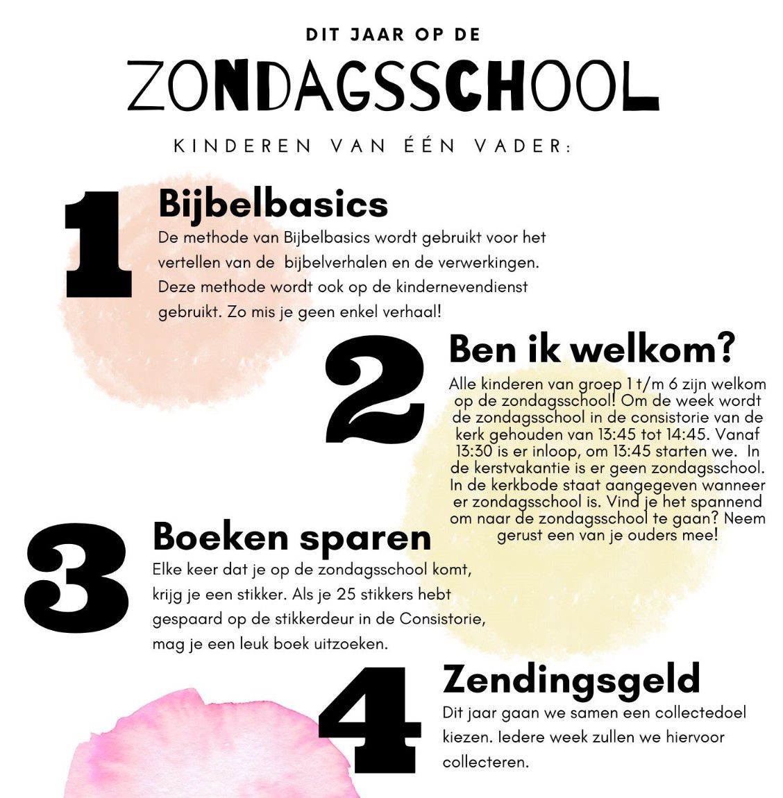 De zondagschool is om de week van 13.45 tot 14.45 uur in de consistorie.